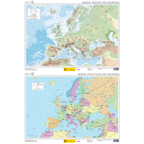 Lámina plastificada impresa a dos caras con el mapa de Europa físico en una cara y el mapa de Europa político en la otra. Dimensiones: 52 x 38 cm.