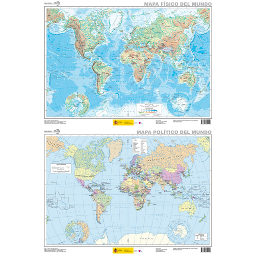 Lámina plastificada impresa a dos caras con el mapa del mundo físico en una cara y el mapa del mundo político en la otra. Dimensiones: 52 x 38 cm.